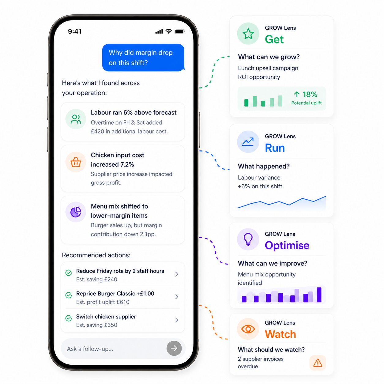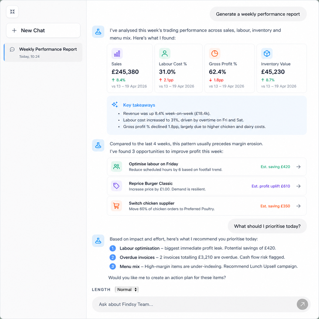 Findsy uses AI to monitor your operation in real time, identify changes, flag risks, and suggest actions. For example, it can highlight unexpected labour costs, shifts in demand, or margin issues, and help your team respond faster.